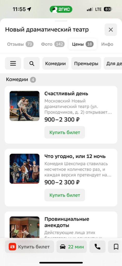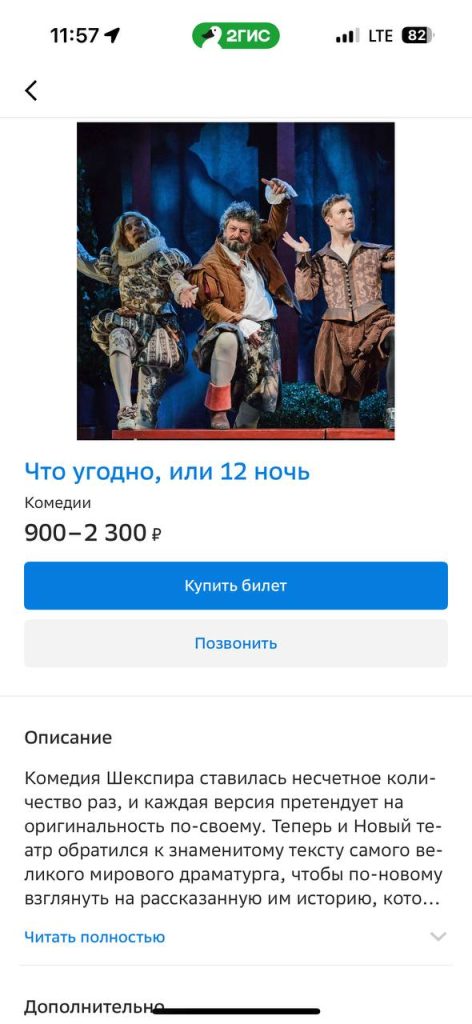 - В поисковой выдаче 2ГИС, когда вы ищете театр или кинотеатр, в карточке компании появилась специальная кнопка «Купить билет» от Афиши. Нажимаете — и попадаете прямо на подборку событий этого места.