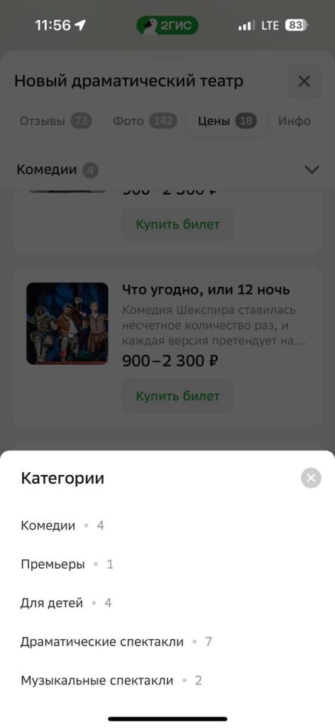 - Внутри карточки театра теперь есть раздел «Цены», где список постановок удобно сгруппирован по жанрам. Никакого листания афиш на сторонних сайтах — всё под рукой.