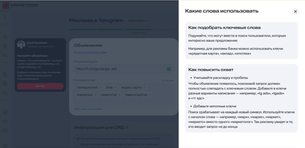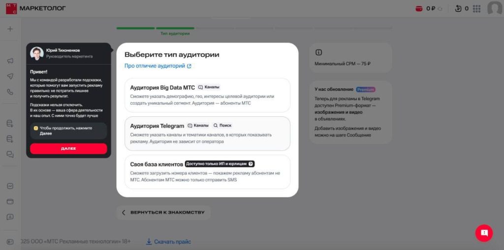 Я был впечатлен ростом MTS Adtech на 25% в год и динамикой выручки в Telegram Ads. Это заставило меня протестировать рекламный кабинет «МТС Маркетолога».