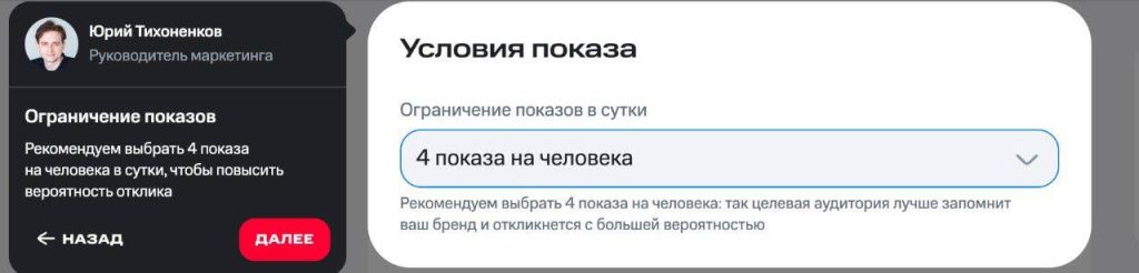 Особо понравились тексты с нотками заботы и желанием помочь. Например, на этапе выбора бюджета есть предупреждение: «Не запускайте рекламу на все деньги сразу. На первые 3-4 кампании выделите небольшой тестовый бюджет — увеличивайте его позже, на основе статистики».