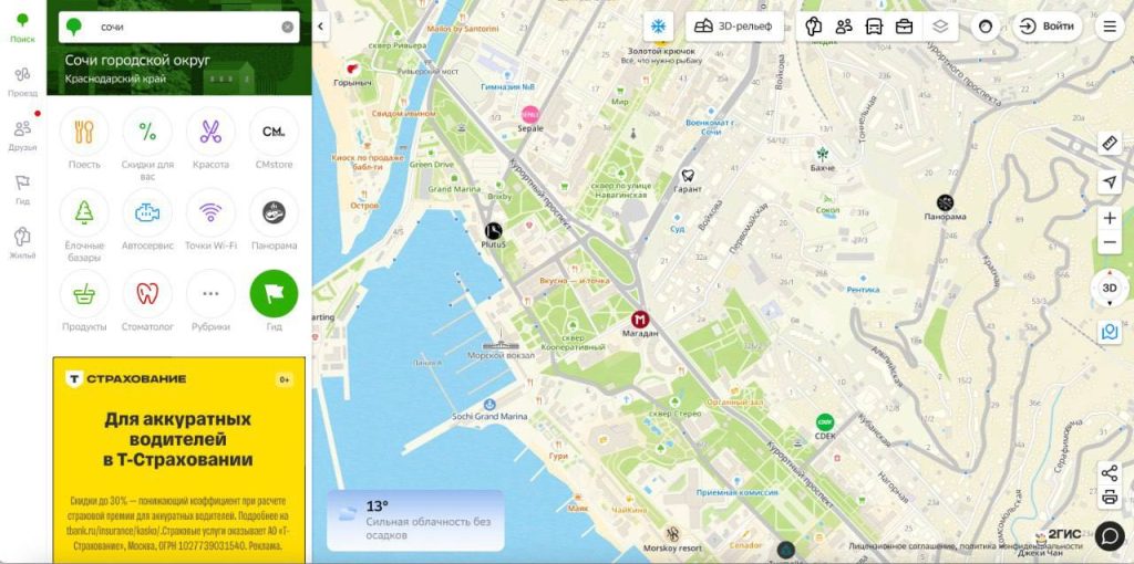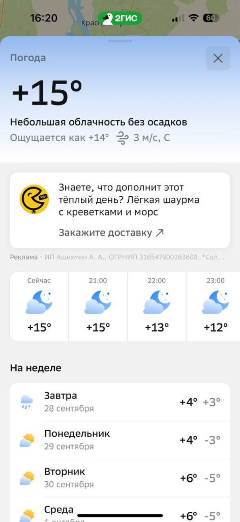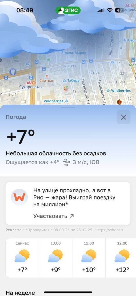 В октябре я уже рассказывал о рекламных позициях в мобильном приложении. Но время не стоит на месте, и у нас отличный апдейт: «Погода» появилась в вебе — на 2gis.ru.